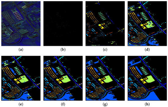Among them, Figure 8a is the Pavia University data, Figure 8b is the selected small number of labeled sample sets, and Figure 8c–g are the algorithm iterations to the first, third, fifth, seventh, ninth rounds of output. And the classification accuracy () of these iterations of the algorithm is shown in Table 4. Figure 8h is the ground truth of the Pavia data set. The algorithm stops when iterating to the 12th round, with a final classification accuracy () of 85.63%.