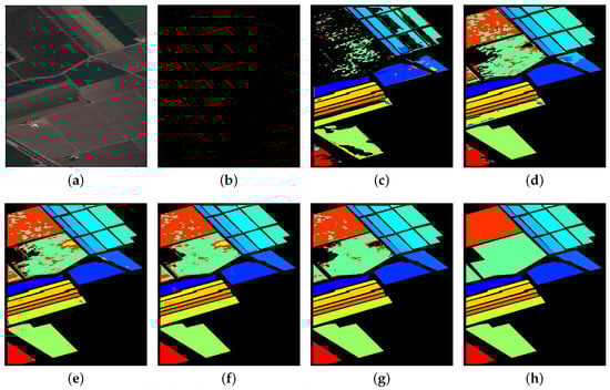 Among them, Figure 9a is the Salinas data, Figure 9b is the selected small number of labeled sample sets, and Figure 9c–g are the algorithm iterations to the first, third, fifth, seventh, ninth rounds of output. And the classification accuracy () of these iterations of the algorithm is shown in Table 4. Figure 9h is the ground truth of the Salinas data set. The algorithm stops when iterating to the 11th round, with a final classification accuracy () of 97.37%.