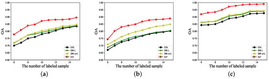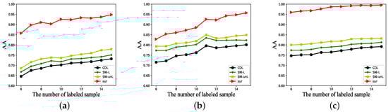 For this method, the number of initial labels selected has a large impact on performance. In order to investigate the effect of the number of initial labels on the labeling results, we conduct experimental validation. Each time the number of initial labels for each class is selected from 6 to 15, the values of the three indicators , and are obtained. We conduct five experiments to obtain the mean of the three indicators, then the number of initial labels with the x-axis as the initial selection, and the y-axis for the corresponding , , indicators to draw their images. From the image index curve, it can be obtained that the number of initial labels does have an effect on the labeling result. Figure 10, Figure 11 and Figure 12 correspond to changes in , , and indicators for the classification results of the four classification methods.