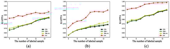 Similarly, the Figure 12 shows how the indicator changes with the number of labels initially selected varies. We know that can be divided into five groups to indicate different levels of consistency: 0.0–0.20 is extremely low, 0.21–0.40 is normal, 0.41–0.60 is medium, 0.61–0.80 is highly consistent, and 0.81–1 is almost identical. It can be seen that almost all algorithm results increase with the number of initial labels increasing. Our method indicator is almost between 0.81 and 1, which is always higher than other algorithms, that is, our method has higher classification consistency.
