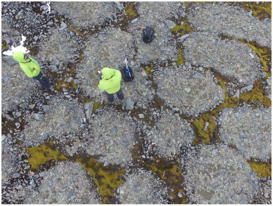 The sites selected for developing the surveys are located in the ice-free areas of Barton Peninsula (62°14′S; 58°46′W) in King George Island, the largest one of the South Shetlands in Antarctica (Figure 2 left). This peninsula has an area of about 10 km2 that started to be exposed about 8000 years ago after glacial retreat [32]. It shows a rugged topography, with a wide and gentle slope in the central area, ranging from about 90 to 190 m a.s.l., where the majority of stone circles fields are found [33]. It is also one of the regions in Antarctica where sorted stone circles are more ubiquitous and therefore an adequate location to study such type of patterned ground.