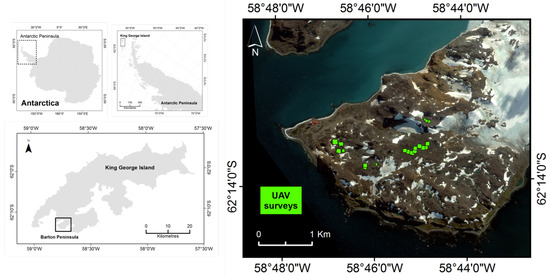 Barton Peninsula in King George Island (left) and location of the UAV survey sites in 2018 plotted over a WorldView 2 satellite image (right).