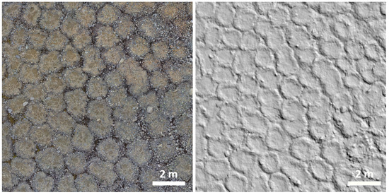 There are small variations in the spatial resolutions of the final mosaic and DEM from site to site due to the natural fluctuations in position of the UAV along the development of the aerial surveys. The spatial resolution for all mosaics is in the range of 2.6–3.2 mm/pixels, while, for all DEMs, is in 2.1–2.4 cm/pixel. These variations in resolution are small and thus can be considered negligible for the generic application of detection methods. However, only the DEM were used in this work, as the geometric information provided is the most relevant to detect and delineate the circles. The use of RGB color information can be more difficult to interpret since color is not directly related to geometry. However, RGB information may be helpful to solve ambiguous situations, when the transitions between the geological materials of the circles and background have a poor expression. On the contrary, if vegetation also occurs with the patterned ground, namely mosses surrounding the circles or lichens on top of the their stones (which does not happen in all field sites), some additional information (edges) can be used and therefore improve the performances. This approach deserves being exploited in the future.