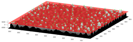 For the detection algorithms, ground truth (GT) information was built by detecting visually all the circles in each DEM image and annotating manually their centers using an image analysis software (MATLAB, version 9.6 (2019a), MathWorks, Natick, Massachusetts, USA). The algorithms also identify a set of centers, so we need to establish a correspondence between the detected and ground truth centers. This was achieved through a simple matching algorithm defined as follows. First, we build a matrix of distances from all the GT centers to all the detected centers. The minimum element of the matrix is found (excluding the diagonal elements) and the corresponding points are matched, provided that their minimum distance is smaller than a given threshold Δ. If two points are matched, they are considered a true positive (TP) detection and the corresponding line and column are removed from the distance matrix. The process is repeated until there are no more candidates for matching. The ground truth points not matched are considered false negatives (FN), and the detected points that were not matched are considered false positives (FP).