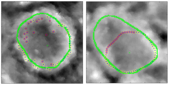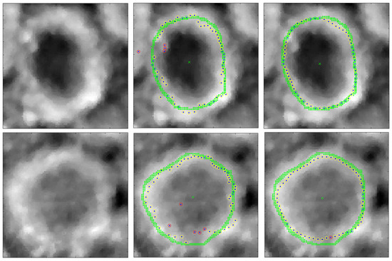 The delineation does not always provide an accurate contour. Two examples are shown in Figure 9 in which SBF and DP fail. In the first case (SBF), there are strong elevation artefacts that produce spurious detections in some directions. In the second case (DP), the shape of the contour can no longer be approximated by a circle and the shape model (circle) does not fit the image.