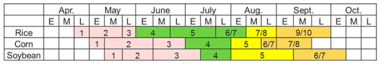 Crop calendars for the three major crops (corn, rice, and soybean) in the Sanjiang Plain [30,31]. We divided a month into three parts (e.g., early April (E), middle April (M), and late April (L)). Rice: 1, sowing; 2, seeding/flooding; 3, transplanting; 4, reviving; 5, tillering; 6, booting; 7, heading; 8, milk stage; 9, mature; and 10, harvest; Corn: 1, sowing; 2, seeding/three leaves; 3, seven leaves; 4, stem elongation; 5, heading; 6, milk stage; 7, mature; and 8, harvest; Soybean: 1, sowing; 2, seeding; 3, the third true leaf; 4, flowing; 5, pod setting; 6, mature; and 7, harvest.