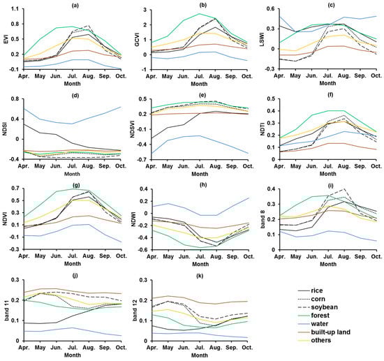 Time series profiles of major crops (corn, rice, and soybean) and other land cover classes (forest, water, built-up land, and others) for 11 vegetation indices and three bands. Panels from (a) to (k) represent EVI, GCVI, LSWI, NDSI, NDSVI, NDTI, NDVI, NDWI, band 8, band 11, and band 12, respectively. The horizontal and vertical axes refer to the month of year and the spectral index or band values, respectively.
