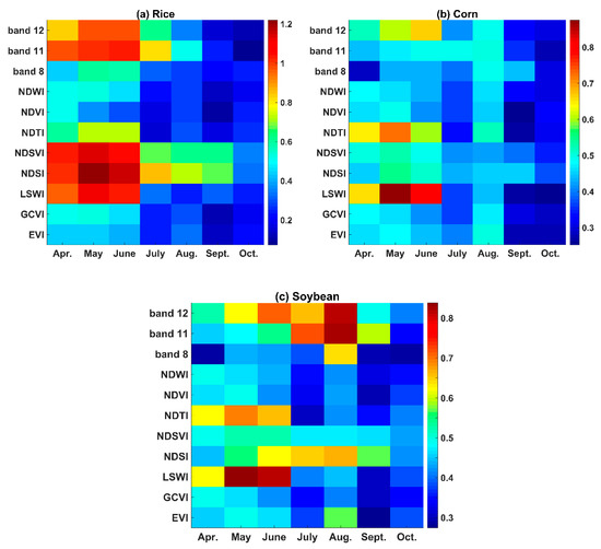 In terms of separating rice from other land cover classes, as shown in Figure 5a, the three spectral indices LSWI, NDSI, and NDSVI are the most important spectral features, and the three months April, May, and June are the most important temporal features. In the process of separating corn from other land cover classes, as shown in Figure 5b, the two vegetation indices LSWI and NDTI are the most important spectral features, and the two months May and June are the most important temporal features. In the process of separating soybean from other land cover classes, as shown in Figure 5c, the spectral index LSWI and the two bands 11 and 12 are the most important spectral features, and the three months May, June, and August are the most important temporal features.