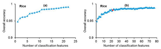 According to the classification accuracies generated by the feature selection process, classification accuracy curves of individual optimal feature sets for rice, corn, and soybean were plotted (Figure 6a,c,e). In order to compare with the classification accuracy of optimal features, we compared classification accuracy for each crop, and classification accuracy curves of individual unoptimized feature sets (including all features in order of separability) for rice, corn, and soybean were also plotted (Figure 6b,d,f). The horizontal axes of the graphs in Figure 6 represent the number of classification features, while the vertical axes represent the overall accuracy of each classification. From Figure 6a,c,e, we can see that after removing redundant information, the classification accuracy improved as the number of classification features increased. Although we sorted all features according to their global separability from high to low, with the increase in the number of classification features, the classification accuracy did not increase in Figure 6b,d,f, but declined to a certain extent under the trend of overall increase. This is because there is redundant and correlated information between classification features. When information redundancy between features damages accuracy more than its contribution to accuracy, features redundancy is caused, which is called the "curse of dimensionality" [22,23]. The ASTFS method removes the redundant and correlated information contained in the feature set. By using the optimal classification features, the overall accuracies of individual rice, corn, and soybean probability maps were 99.15%, 96.69%, and 97.75%, respectively, which are the maximum in the three results. With the same number of features with maximum SIglobal values as the number of optimal features (the red triangles in Figure 6b,d,f), the classification accuracies only reached 98.25%, 91.33%, and 96.74%. Using all of the features of rice, corn, and soybean, their classification accuracies were 98.85%, 96.29%, and 96.89%. This just confirms the "curse of dimensionality" phenomenon mentioned above: Simply stacking many classification features will not improve the classification accuracy, but will cause information redundancy and reduce the classification accuracy.