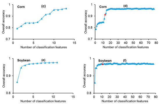 Classification accuracy curves of individual optimal (a,c,e) and unoptimized (b,d,f) feature sets for rice, corn, and soybean. The red triangles in (b,d,f) correspond to the same number of features with the maximum global separability values as the number of optimal features (a,c,e).