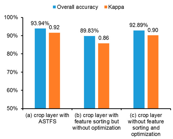 In order to evaluate the reliability of the resultant crop layer based on the ASTFS method, we compared it with another two results from (1) all of the 77 spectro-temporal features for each of the three crops without feature optimization (“crop layer without feature sorting and optimization”), and (2) the same number of features with maximum global separability values as the optimal features (“crop layer with feature sorting but without optimization”).