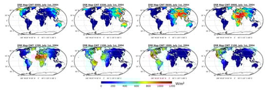 The MCD18 product suite includes two data products: DSR (MCD18A1) and PAR (MCD18A2). The products are archived in Hierarchical Data Format V4—Earth Observing System (HDF-EOS) format files. MCD18A1 and MCD18A2 are daily gridded Level 3 products in the MODIS sinusoidal map projection. Each MCD18 file contains two major types of scientific data sets: instantaneous DSR or PAR arrays for each individual MODIS overpass and 3-h radiation arrays at 00:00, 03:00, 06:00, 09:00, 12:00, 15:00, 18:00, 21:00 in Coordinated Universal Time (UTC). Besides, an array of quality flag is used to indicate the input source of surface reflectance data. The MCD18 Collection 6.0 products are produced at the spatial resolution of 5 km, while the new Collection 6.1 products will be available at an improved 1 km spatial resolution. In the Collection 6.1, additional Climate Modeling Grid (CMG) products (MCD18C1 for DSR and MCD18C2 for PAR) are generated at the spatial grid of 0.05° in the latitude/longitude map projection. An example of global maps of 3-hourly DSR product is shown in Figure 1. It is clearly seen that large amounts of solar radiation move from the east to the west with the Earth rotation.
