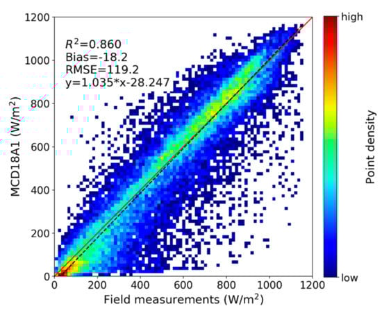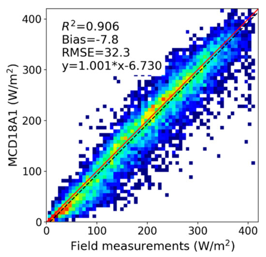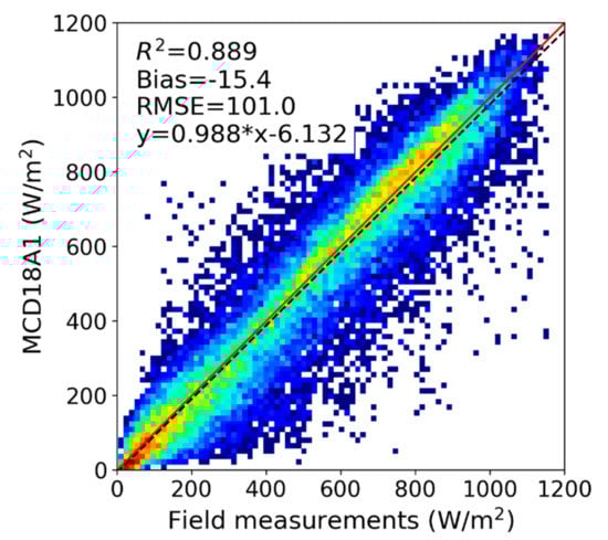 Two other global DSR products (Clouds and the Earth’s Radiant Energy System (CERES) and Global LAnd Surface Satellite (GLASS)) were also validated using the same data set of ground measurements and the results were compared with the MCD18A1 product. The gridded CERES DSR product is available at 1° spatial resolution and several levels of temporal resolution [25]. The latest GLASS DSR product has a spatial resolution of 5 km and is only available at the daily temporal resolution [26]. The validation results of daily CERES and GLASS products are shown in Figure 9. CERES has the highest accuracy with RMSE of 28.8 W/m2 and R2 of 0.920. GLASS has a larger negative bias of 7.6 W/m2 and greater RMSE of 35.9 W/m2. The accuracy of the MCD18A1 product is between them, with RMSE 3.5 W/m2 higher than CERES and 3.6 W/m2 lower than GLASS. However, it needs to be noted that the CERES product incorporates global geostationary satellite data better capturing the diurnal DSR variability with a much coarser spatial resolution, while MCD18 and GLASS radiation products use only the polar-orbiting MODIS observations.