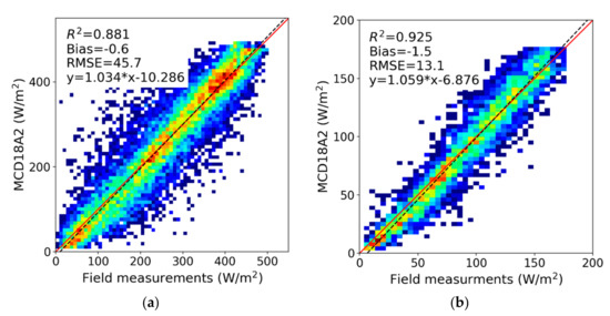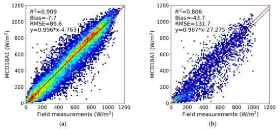 Validation results of the MCD18A1 DSR product with two different inputs of surface reflectance: (a) MCD43A3 product and (b) surface reflectance climatology.