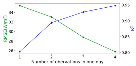 To further evaluate the impacts of daily overpass counts on the accuracy of estimating daily DSR, the validation results are grouped by their number of MODIS overpasses within a day. The overpass counts have little impact on the bias of daily DSR. However, the importance of multiple observations in terms of reducing estimation errors is significant (Figure 8). If there is only one MODIS overpass, RMSE of estimating daily DSR is as high as 35.4 W/m2. RMSE drops to 33.0 W/m2, when the number of overpasses increases to two. RMSE can further decrease to 25.8 W/m2 if the daily overpass count reaches four. Not surprisingly, the R2 value increases with the number of daily MODIS overpasses. This finding is in line with our previous studies on temporal scaling of daily surface shortwave net radiation. As the overpass time of MODIS typically is close to noon when solar radiation reaches the maximum, two MODIS observations a day can generate daily estimates with rather high accuracy [24].