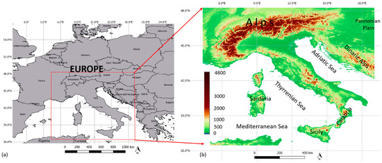 The study area is located in the central-southern part of Europe (Figure 1a) encompassing a wide range of terrestrial and marine ecosystems mainly dominated by Mediterranean environments. However, large areas are characterized by continental and tundra landscapes and there are some limited patches containing semi-arid (steppe) ecosystems.