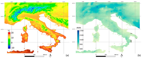 The mean annual temperature in the area, reported in Figure 3a, was estimated from latitude, longitude, and elevation according to a regressive model appositely devised for Europe and parameterized with the support of geostatistical tools. The model parameters were estimated from temperature data measured at 387 European meteorological stations mostly provided by the European Climate Assessment & Dataset (ECA&D) [20]. As for annual precipitation averaged over the observational period (Figure 3b), orography and latitude are the main driving factors for the precipitation amount. There is a rather evident inverse relationship between the two variables, which is particularly worrying in areas where summer months are contemporaneously the warmest and the driest.
