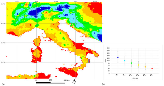 Median values progressively decrease in the passage from C1 to C6 (Figure 4b); the range (Q3–Q1) computed for the cluster centroids, which includes 50% of the precipitation values, decreases accordingly. This means that a large variability is observed where median values are high, especially in mountainous areas, whereas narrower distributions characterize drier areas. It is interesting to note that clusters are nested inside each other; an ideal line that would connect C1 to C6 should cross all the other ones. Along the east side of the Adriatic Sea, in particular, clusters boundaries follow the coastline and, going inland, we cross all the clusters from C6 up to C2 (C1 in the area of the Dinaric Alps). The inverse succession from C2 to C6 appears if we further penetrate the continent until the Pannonian Plain. C1, C2, and C3, which include more rainy areas, mostly collect mountain climates (ET, Dfa, and Dfc); on the other hand, in C5 and C6, where precipitation are more scarce, temperate and arid climates dominate (Csa, Csb, Cfa, Cfb, and Bsk). C4 appears to be an intermediate class and is the most heterogeneous, as it is composed by pixels from all the climate zones with the exception of the extreme ones.