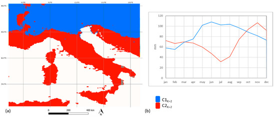 The analysis of the spatial coherence of the seasonal timing was performed on normalized data (zero mean and unitary variance). The optimal number of clusters was obtained estimating the average value of the mean Silhouette SI for different values of K and selecting the K value which produces the highest SI. The best result (SI ≅ 0.8) was obtained for K = 2. The spatial partition so obtained (Figure 5a) roughly separates continental areas (curves with maximum values in summer) from southern areas more directly affected by the influence of the Mediterranean Sea (curves with minimum values in that period), as shown in Figure 5b. If we exclude the effect of orography, we find a reasonable agreement with the Köppen–Geiger Df and Cf macro-groups.