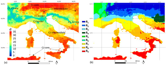 The results of these estimations are reported in Figure 6a. Seasonal variability within clusters is not randomly arranged but is organized in swaths that gradually change in the North–South direction. The core areas of the two clusters (the reddest ones in Figure 6a) are linked by a sequence of regions with in-between features. Two complex regions in the west and east part of the continental area account for more complex zones. In order to segment the investigated area in the regions qualitatively identified in Figure 6a, we defined the boundaries of nine areas with the help of K-means applied with K = 9.