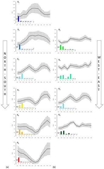 Figure 7b illustrates the West-to-East sequence. These clusters show the most uniform profiles, especially in the westernmost part. In R5 and R6, there is no sign of seasonality properly defined and precipitation levels are high along all the year and their centroids are rather close. We did not group them in a unique region as they belong to C1k = 2 and C2k = 2, respectively (see Figure 5a). This lack of a proper seasonality is picked up by the power spectrum, which shows contributions from all the frequencies. This behaviour significantly changes at the boundary of R6 where this nearly uniform distribution seems to be split in the three R1, R2, and R3 seasonal patterns. In Figure 7b we have reported the already discussed two-season pattern of R3 which exhibits the higher analogy with R4, in the easternmost part of the region, which again shows an increase in irregularity with only a slight maximum in the late spring. Within clusters R7, R8, and R9, summer is the driest season in the warmest period of the year. In practice, all the Mediterranean areas show this feature. About 90% of the minimum values fall in July and 5% in August. If temperature would further increase concomitantly with drought frequency and persistence, these areas would be very vulnerable to climate risk. Already today the mean summer values in the southernmost and insular areas are very low (Figure 8), especially along the coastlines, where often minimum values are lower than 10 mm.