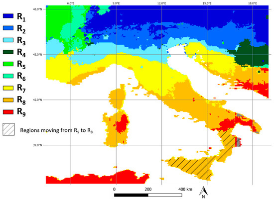 According to the IPCC climate projections for the study area [48], the precipitation amount should decrease in some areas of Southern Europe in the three-decade period 2071–2100 with respect to 1961–1990. Different Regional Climate Models (RCM) predict significant changes in the precipitation regimes characterizing the areas of Calabria and Sicily (Southern Italy, cluster R9). In particular, the RCA3-BCM (Bergen Climate Model), an RCM including a full description of the atmosphere and its interaction with the land surface, predicts a statistically significant precipitation decrease (20–30%) in winter values for both the regions and in summer values for Calabria [49]. This is an example of geographically confined and seasonally asynchronous change, as different months are differently affected by change. Thus, we modified the CHIRPS data by decreasing the current winter values in Calabria and Sicily as well as the summer values in Calabria by 25%. Then we repeated the clustering described in Section 4.2, selecting the current precipitation curves as initial centroids for the K-means iterative algorithm. The first interesting result is that the algorithm did not modify these initial centroids, which still represent characteristic seasonal curves in the area. In the light of this result, we did not increase the number of clusters. Figure 9 shows that both the regions affected by change move from R9 to R8 as seasonality in these areas becomes more asymmetric due to the decrease in winter values. Such a kind of change breaks the continuity of cluster R9 slightly redesigning the geography of the precipitation seasonal timing in Southern Italy, where R9 appears to be confined in isolated aggregations surrounded by R8. Changes in summer values predicted for Calabria do not produce effects as this decrease does not modify the seasonal timing but only the magnitude of minimum values. This change in summer values, however, would trivially modify the map of the most climatically vulnerable areas illustrated in Figure 8, showing an increase of the climatic risk in Calabria due to the decrease of precipitation values in the warmest period in the year.
