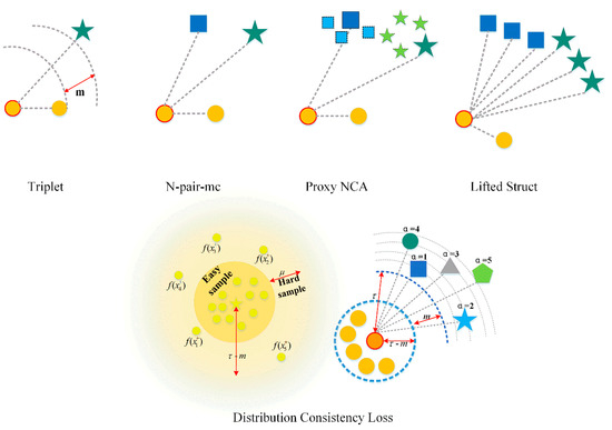 Hard sample mining is an important means to speed up the convergence of learning algorithms, improves the generalization ability of the network and the learning effect [10,56,57]. TriHard loss [17] is a kind of online sampling method for hard samples based on a training batch, which is improved on the basis of triple loss. For each batch, select one of the hardest positive samples and one of the hardest negative samples as an anchor point to form a triple, although this method produces only a small number of triples. When we need enough triples, we usually need a larger batch [10]. MAML [58] only selects the most hard positive sample pair and the most hard negative sample pair for each picture in the batch, which is a hard sample that is harder than TriHard. In addition, it also considers the relative distance and absolute distance, and the performance is better than TriHard loss. N-pair loss considers the query sample and the negative samples of several other different classes in each parameter update process, which speeds up the convergence of the model. Lifted structure loss is based on all positive and negative sample pairs in a mini batch to calculate loss. The triplet of the triplet loss is determined in advance, and all negative samples are considered during the construction process. Proxy NCA loss [22] selects a sample closest to a small portion of the data in the training set as a proxy when sampling. For ranked list loss [59], the sampling strategy is to select samples whose loss function is not zero. Although all samples within the threshold were mined, the differences between the negative sample classes and the effects of surrounding samples were not considered.