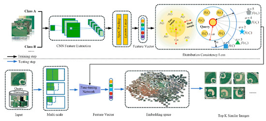 An illustration of the proposed framework. At the top we train our network by the distribution consistency loss (DCL). The DCL consists of two parts: sample balance loss of positive samples and ranking consistency loss of negative samples. This loss established a valid feature representation by optimizing the distribution of hard and easy samples within the class, as well as the sorting of different types between classes. In the test phase, we input the image through multi-scale processing and input it into the fine-tuning network completed by the training phase, and then return the first K images associated with the query image.