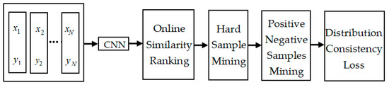 Sample mining can achieve rapid convergence of networks and improve network performance. It is widely used in metric learning [10,17,19,60,61,62,63]. Given a query sample , in order to mine the positive and negative samples, we first use the currently effective network [50] to extract the image features, and use the extracted features to calculate the Euclidean distance between all samples and the query sample and do the ranking based on the distance. We define as a collection of the same category with the query image, which is expressed as , . is a collection of other images, represented as , We create a dataset of tuples , where represents the query image, is the positive set selected from , and is the negative set selected from . The training image pairs consist of these tuples, where each tuple corresponds to positive sample pairs and negative sample pairs.