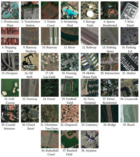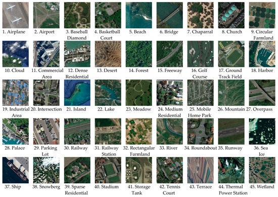 NWPU-RESISC45 dataset [27] consists of 31,500 images, which is a large-scale RS image archive. It contains 45 classes: airplane, airport, baseball diamond, basketball court, beach, bridge, chaparral, church, circular farmland, cloud, commercial area, dense residential, desert, forest, freeway, golf course, ground track field, harbor, industrial area, intersection, island, lake, meadow, medium residential, mobile home park, mountain, overpass, palace, parking lot, railway, railway station, rectangular farmland, river, roundabout, runway, sea ice, ship, snowberg, sparse residential, stadium, storage tank, tennis court, terrace, thermal power station and wetland. Each class contains 700 images which measure 256 × 256 pixels, and the spatial resolution of them varies from 30 to 0.2 m. All of the images were collected from Google Earth, covering more than 100 countries. For the NWPU-RESISC45 dataset, we follow the data splitting strategy of 80% training and 20% testing as per [25]. Figure 7 presents sample images in the dataset.