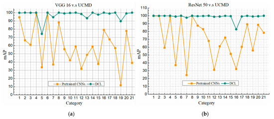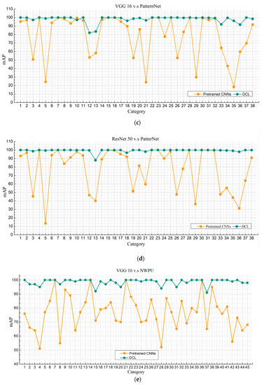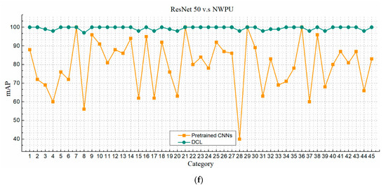 As we can easily see from Figure 11, the DCL loss we have proposed is stable and can reach 95% in almost all categories. When using the ResNet50 network, the mAP can be stabilized at around 98%, and even in some categories, it can reach 100%. Furthermore, whether on the UCMD dataset, PatternNet dataset or NWPU dataset, our DML-based features for content-based remote sensing image retrieval achieves the best performance, which proves that our method is useful to RSIR.