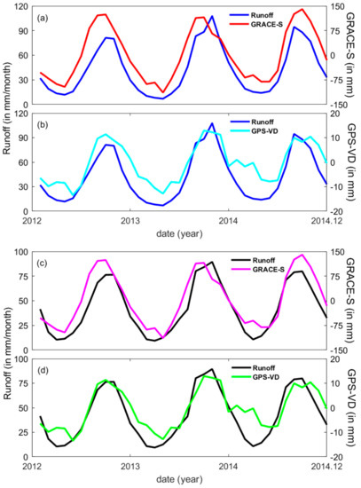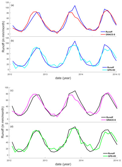 Runoff reconstructed from (a,c) GRACE and (b,d) GPS at (a,b) MC-pair station, and (c,d) TC-pair station.
