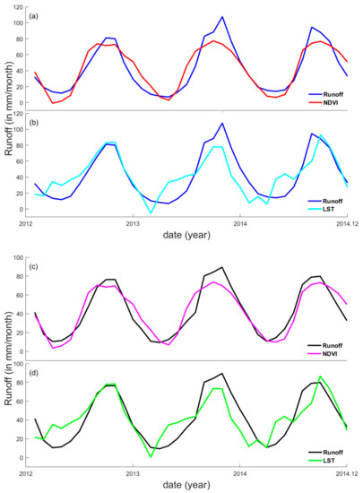 Runoff reconstructed from (a,c) NDVI and (b,d) LST at (a,b) MC-pair station, and (c,d) TC-pair station.