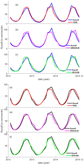 Runoff reconstructed from (a,d), PDSI, (b,e) GRACE-SI, and (c,f) GPS-DSI, at (a–c) MC-pair station and (d–f) TC-pair station.