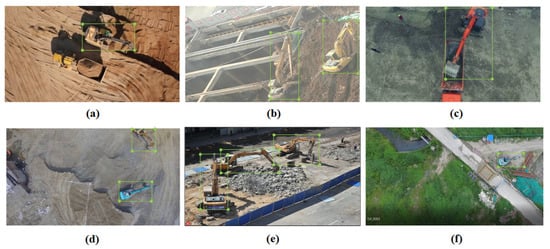 Examples of the annotated images containing excavators of different sizes, colors, and postures. The images were taken from different viewing directions. (a) Vertically viewed image with a yellow excavator; (b) obliquely viewed image with two yellow excavators; (c) obliquely viewed image with a red excavator; (d) vertically viewed image with two excavators of different colors; (e) obliquely viewed image with three yellow excavators in different postures; and (f) vertically viewed image with a blue excavator.