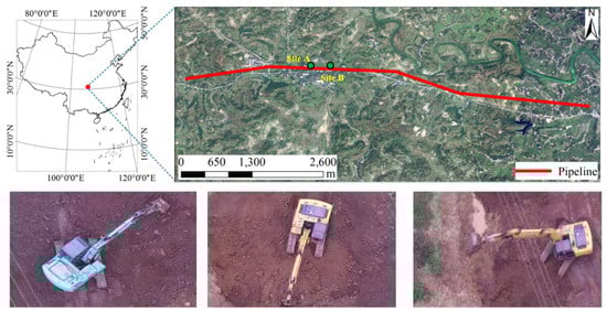 The area for testing the proposed approach and UAV-ED system is located in Qu county, Sichuan province, China (Figure 2). The length of the pipeline in Qu county is approximately 35 km. Due to the abundant soil resources and many infrastructure constructions projects in Qu county, excavators often work around the pipeline and, thus, seriously threaten the pipeline’s safety. Currently, the pipeline is inspected in the field by laborers twice a day. Because the pipeline is 20 to 100 m away from the main road, the manual monitoring approach is inefficient and time-consuming. Due to the limitation of the flight distance of the UAV, a part of the pipeline was selected to test the proposed approach and UAV-ED system. The total length of the selected pipeline was about 5 km. The land-cover types of the selected area included grassland, bare soil, built-up surface, ponds, and roads. Therefore, the selected area was very typical for testing the proposed approach and UAV-ED system.