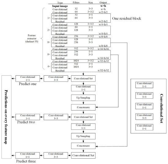 The architecture of the excavator detection model based on You Only Look Once V3 (YOLOv3). It has 75 convolutional layers, with residual layers and upsampling layers. The excavator detection model uses darknet53 as the backbone to extract the features of the input image and detects the excavators on three different scale feature maps [43].