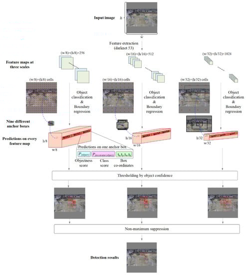 The flowchart of the trained excavator detection model is shown in Figure 4. During the detection process, the darknet53 network model [45] under YOLOv3 was employed to extract the features from the entire image and generate feature maps at three scales. The three feature maps have (w/8) × (h/8), (w/16) × (h/16), and (w/32) × (h/32) cells, respectively (w is the width of the image and h is the height). Cells in different feature maps have different receptive field sizes [37]. There are nine different anchor boxes used to make predictions in the three feature maps in total. For each feature map, object classification is performed in every cell to calculate the confidence of containing excavators at three different anchor boxes with the cell as the center. In addition, the three anchor boxes are used to perform the boundary regression to predict the bounding box of the excavator for each cell. The predicted outputs on one anchor box of one cell contain six values, including the center coordinate of the bounding box (tx,ty), the width and height of the bounding box (tw,th), the confidence for the anchor box containing the target object (P(object)), and the confidence of the detected object being an excavator (P(excavator|object)). Since excavators are the only target object in this experiment, the confidence of the detected object being an excavator is always 100%. Using three scales to extract features and nine anchor boxes to perform the boundary regression makes the trained excavator detection model able to detect excavators of different sizes and postures. To prevent the detection of the same excavator several times, the confidence obtained and the predicted bounding box are subjected to objectness score thresholding and non-maximum suppression (NMS) to obtain the most likely bounding box of the detected excavator.