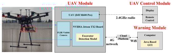 Integration of the aforementioned excavator detection model, the UAV, and related components makes it possible to establish a system to monitor the excavators automatically. The UAV-ED system is composed of three modules, including the UAV Module, the UAV Control Module, and the Warning Module. The architecture of this system is shown in Figure 5. Details of these modules are presented in the following subsections.