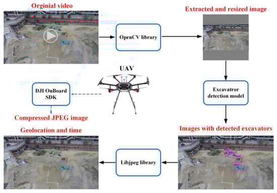 The UAV Module is to detect the excavator, determine the geolocation, and transfer the information to the other two modules. The main hardware components of the UAV module are the UAV (DJI M600 Pro), the EO camera (FLIR BFLY-U3-13S2C-CS), and the embedded board (NVIDIA Jetson TX2 board). In addition, the UAV has a mounting board to mount the embedded board and a gimbal to mount the FLIR camera. Before mounting the NVIDIA embedded board on the UAV, the previously trained excavator detection model was deployed in the embedded board. In addition, three libraries were imported into the embedded board, including the Open Source Computer Vision (OpenCV) library in version 3.4, the Libjpeg library, and the DJI onboard Software Development Kit (SDK). OpenCV is an open source computer vision and machine learning software library, which was built to provide a common infrastructure for computer vision applications [46,47]. The Libjpeg is a widely used C library for reading and writing JPEG image files [48]. The DJI Onboard SDK is an open source software library that enables computers to communicate directly with DJI UAVs and provides access to the UAVs’ telemetry [49]. The data-processing flow and the relationship between the excavator detection model and the three previously mentioned libraries are shown in Figure 6.