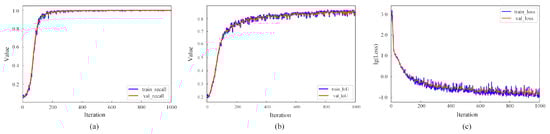 The recall rate, intersection over union (IoU), and loss of the train set and validation set for evaluating the trained model during the training process.