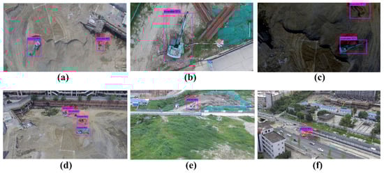 The results showed that the UAV-ED system accurately detected all the excavators around the pipeline with different backgrounds and flight altitudes. Some examples are shown in Figure 11. The images displayed were acquired in different situations and accurate detection results were obtained from images with multiple excavators in Figure 11a, small excavators in Figure 11b, and those even containing only a portion of an excavator in Figure 11d. Furthermore, the flight altitudes in Figure 11e,f and the location of the excavator in Figure 11c did not affect the detection results. The detected geolocations of the excavators also agreed well with the geolocations of the sites recorded previously in the ground survey.