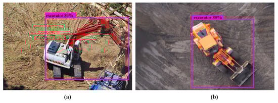 Users may require broader viewing extents with obliquely mounted cameras. Thus, the train excavator detection model was further applied to obliquely taken images, the spatial extents of which are larger than that of vertically taken images at the same flight height. Examples are shown in Figure 8d–f, which also have different backgrounds for the excavators. All the excavators were detected, indicating that the trained excavator detection model also has good performance for obliquely taken images. This finding suggests that the UAV-ED system would be valuable for users that require broad viewing extents and less accuracy for the locations of the excavators.