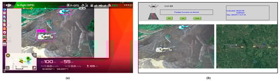 To better test the performance of the UAV-ED system in the transmission of the detection results to the Warning Module, the computer with the Warning Module was placed in UESTC, which is approximately 350 km away from the testing area. During the flights, the real-time video processed by the UAV module could be displayed in the UAV Control Module as shown in Figure 10a. In addition, the detection results (i.e., the images of the detected excavators, the latitudes/longitudes, and time) were transmitted to the Warning Module as shown in Figure 10b.
