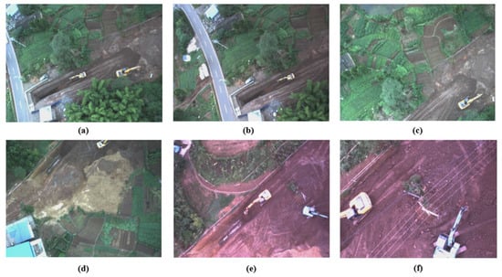Images with detected excavators transmitted to the Warning Module during the UAV remote sensing experiment. The images were in different situations: (a) containing two excavators at Site A; (b) containing a small excavator at Site A; (c) containing an excavator in the corner of the image at Site A; and (d) containing a portion of an excavator at Site B. (e,f) containing the same excavators but acquired at different flight altitudes at Site B. All images were acquired at flight altitudes of 120 m, except (f), the altitudes of which was 60 m.