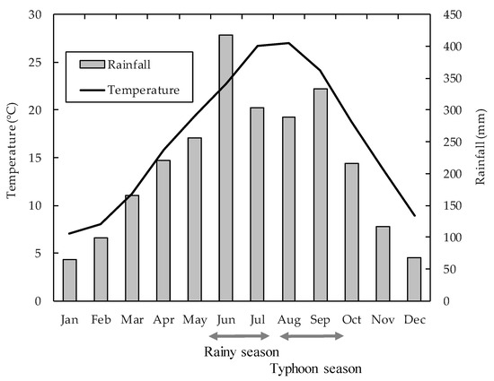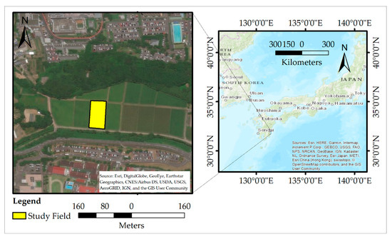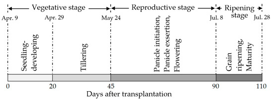 The study field is in the Kibana Agricultural Science Station of the University of Miyazaki, in the Miyazaki prefecture of Japan (Figure 1). The study area lies at a base elevation of approximately 21 m above sea level and it is located at 31°50′14″ north and 131°23′56″ east. The climate of Miyazaki is humid subtropical, with hot and humid summers and cool winters. The average annual temperature is 17.1 °C, and annual precipitation is 2550 mm. Figure 2 shows the monthly average air temperature and rainfall in Miyazaki. The primary rainy season is from early June to mid-July. The season is called as “plum rain” and a large amount of the precipitation is a result of the East Asian monsoon system. In 2018, more than half of the days in June had recorded precipitation around the study area. The monsoon rain is a fundamental water resource for paddy rice cultivation in this area. Another peak of monthly precipitation appears in August to September, which is typically from short-term heavy rains brought by typhoons. Rice is the major staple food in Japan. Popular Japanese rice varieties, Oryza sativa ‘Koshihikari’ and ‘Hinohikari’, are most commonly cultivated around the study area. The first variety, which was planted in the study field, is typically planted in early season (transplants in late March to early April and harvest in late July) for the purpose of avoiding the risk of damage by typhoons in late summer; the later variety is planted in normal season (transplants in June and harvest in October). Figure 3 represents the rice development stages in the study area during 2018, determined by actual field surveys, following the framework of rice development stages used by Wu et al. [25]. The vegetative stage lasts for about 45 days, while the reproductive and flowering stages last for 45 and 20 days, respectively. The number of days slightly changes by year and farmer, depending on the weather conditions and cultivation practices.