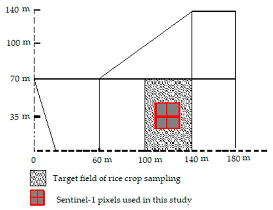 Ten Sentinel-1A time series images of the study area were acquired for the entire cultivation season from April to July 2018. The dates of the image acquisitions are given in Table 1. Sentinel-1 ground range detected (GRD) data of dual polarization (VH and VV polarization), acquired with interferometric wide (IW) mode, were used in this study. The GRD image products with the IW mode are provided by 10 m × 10 m pixel size, but the reference spatial resolution is 20 m × 22 m (range and azimuth directions, respectively), because the product is created by the multi-look procedure of IW images [26]. The acquired SAR images were preprocessed using ESA’s open source Sentinel-1 Toolbox [21]. The process includes radiometric calibration, terrain flattening, and geometric correction. Topographic variations can dominate the radiometric backscatter signal strongly because of the local area illuminated within each azimuth and slant range [27]. The reference area used within the beta naught (β0), sigma naught (σ0), and gamma naught (γ0) backscatter conventions is described by Small [28]. Each convention differs in their choice of definition. The β0 convention is the slant range plane itself [27]. The contents of images conforming to its convention are not subjected to modifications based on ellipsoid or terrain Earth models [28]. σ0 is the ground as modeled by an ellipsoidal Earth. For γ0, the area is the projection in the plane perpendicular to the slant range direction [29]. In our study, first, the radiometry of the SAR backscatter product was transformed into β0 backscatter convention, as is also recommended by Small et al. [30]. Secondly, the range Doppler terrain correction was applied. In this process, once the DEM integration was completed, the normalization was performed by converting β0 to γ0. In this study, the averages of VH and VV polarization backscatter signals read by four pixels from the center of the crop sampling field were used. The locations of the sampling pixels are shown in Figure 4. The study area was composed of five paddy rice fields that were all managed similarly. Considering the 20 × 22 m effective resolution of Sentinel-1A GRD images, the sampled SAR backscatter signals used in this study are not affected by surface conditions outside of the study area.