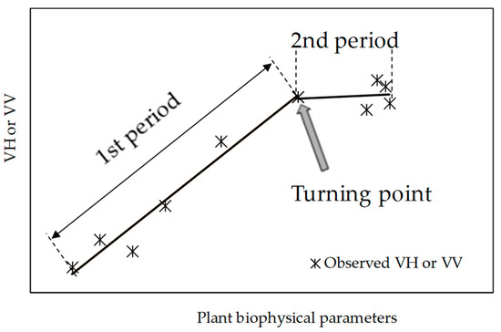 The ground-based biophysical parameters were compared with VH and VV polarization backscattering coefficients of Sentinel-1A, to analyze the relationship between plant biophysical parameters and the SAR backscattering coefficients. The relationships were analyzed using two types of regressions. The first approach describes the relationship with a single polynomial regression equation determined by the least-square method, which is a traditional method of statistical analysis popularly used in this type of study. Another method attempts to describe the relationship by the combination of two linear regression lines. The concept of the two-linear-lines method is illustrated in Figure 6. The basic assumption of this approach is that the SAR backscattering coefficients first linearly increases as the rice plant develops (first period in Figure 6), and then the backscattering coefficient reaches a saturation level at a specific date termed the “turning point” during the cultivation season. In this research, the turning point is defined as the point where the R2 of the linear regression for the first period reaches its maximum. The R2 of the linear regression for the second period (Figure 6) is expected to be a small value, because the SAR backscattering coefficient is saturated in the second period, and thus the backscattering coefficients no longer explain the further changes in plant biophysical parameters.
