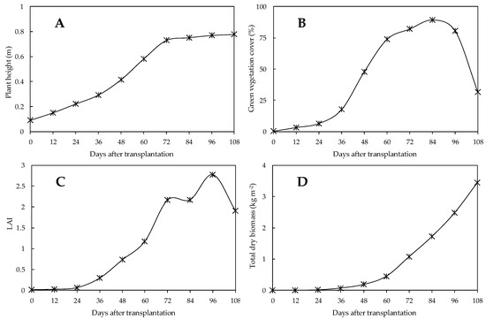 Ground measured temporal variations in (A) plant height, (B) green vegetation cover, (C) leaf area index (LAI), and (D) total dry biomass, after transplantation.