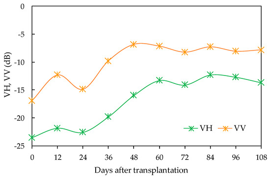 Figure 8 shows the temporal variation in VH- and VV-bands’ backscattering coefficients. The numbers are the averages of four pixels from the center of the study field (Figure 4). Throughout the cultivation season, VV is higher than VH. Both VH and VV backscattering coefficients were the lowest during the initial period of rice cultivation. During this period, green vegetation cover was low (Figure 7B), and the dominant surface observed by satellite is the water surface flooded in the paddy field. The backscattering coefficients increased during the late vegetative stage, and became stable after 48 days (VV) or 60 days (VH). This trend in the backscattering coefficients agrees with those in previous studies [2,25,33].